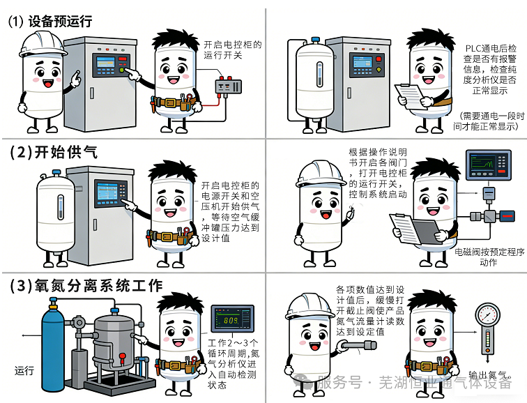 行设备的预运行:开启电控柜的电源开关,plc通电后检查是否有报警信息,检查纯度分析仪是否正常显示(需要通电一段时间才能正常显示)。